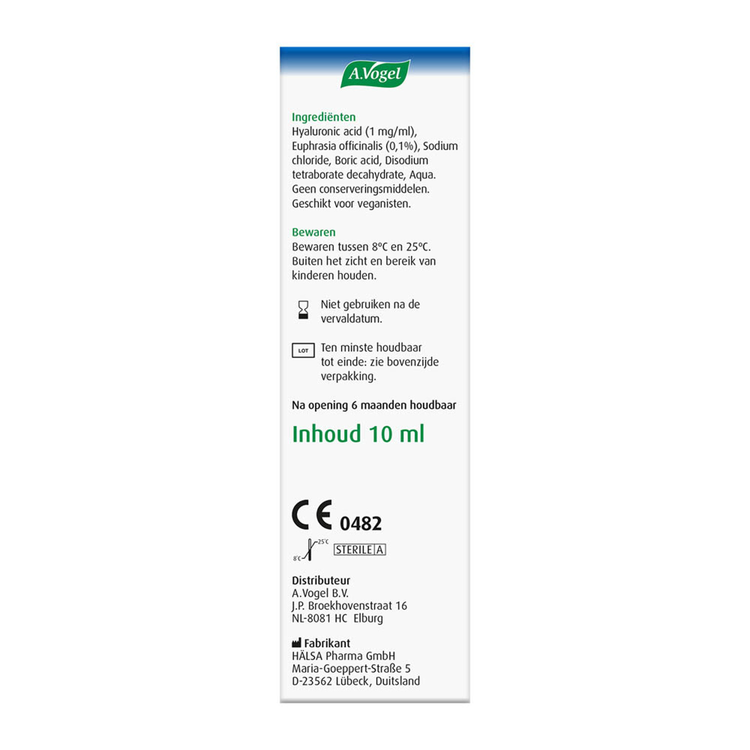 A.Vogel Eye Drops contain the natural ingredients Euphrasia (eyebright) and hyaluronan. The hyaluronan in A.Vogel Eye Drops is made with plant-based, non-GMO soy and non-animal sources, among other ingredients. It helps maintain sufficient tear fluid in the eye. As a result, it provides rapid, pleasant and persistent moisturization of the eye.