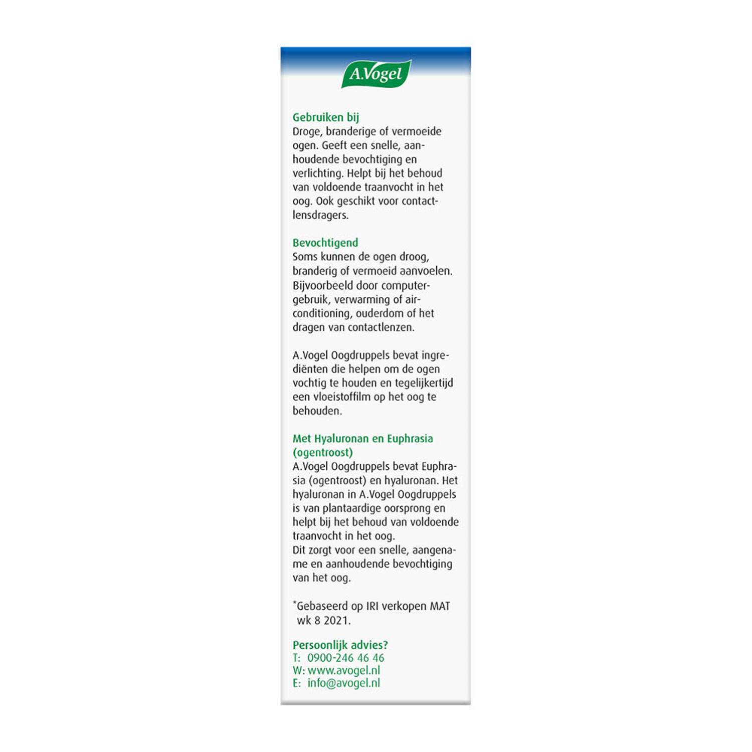 Do you have dry eyes or do your eyes feel tired or burning? Insufficient tear fluid may be the cause. A.Vogel Eye Drops contains the natural ingredients Hyaluronan and Euphrasia Officinalis (eyebright) that quickly and persistently moisturize and relieve the eyes.