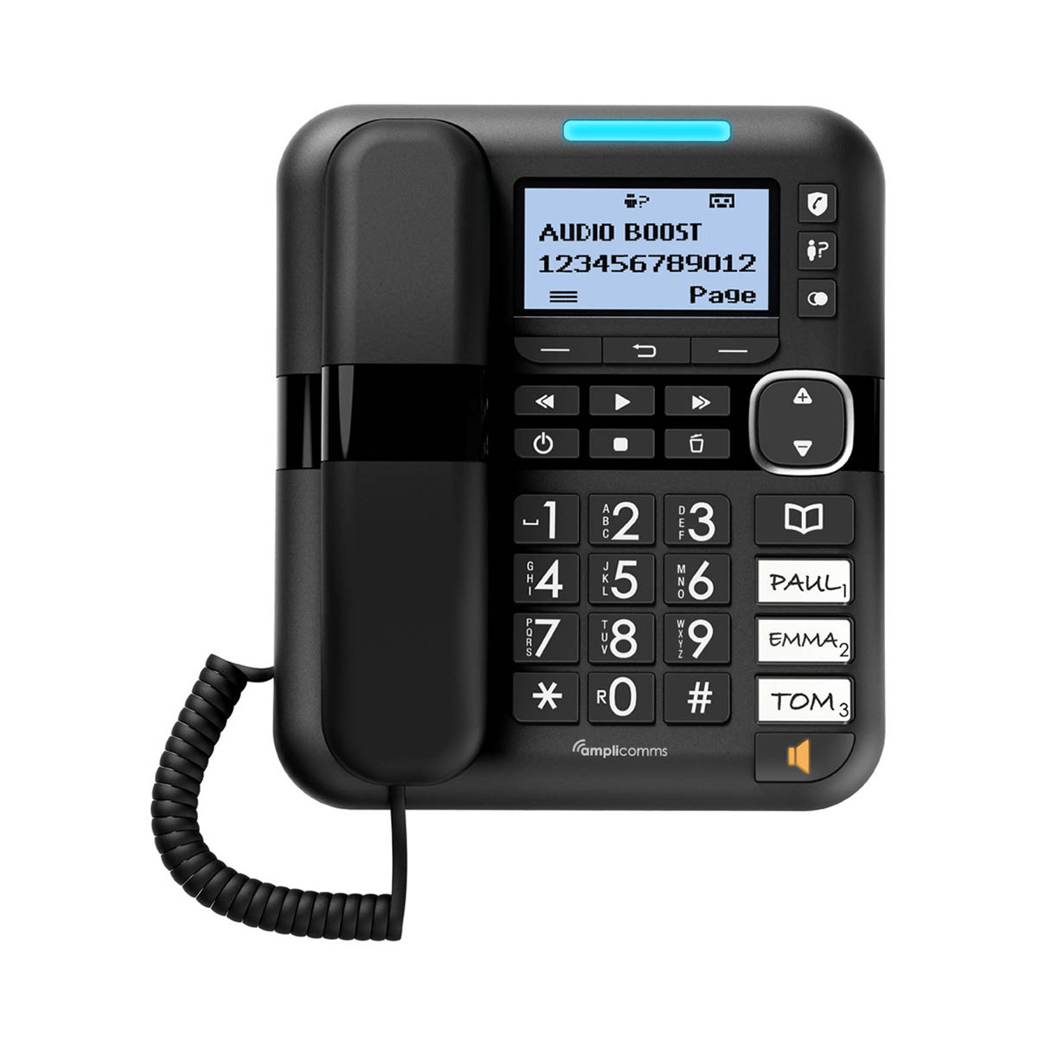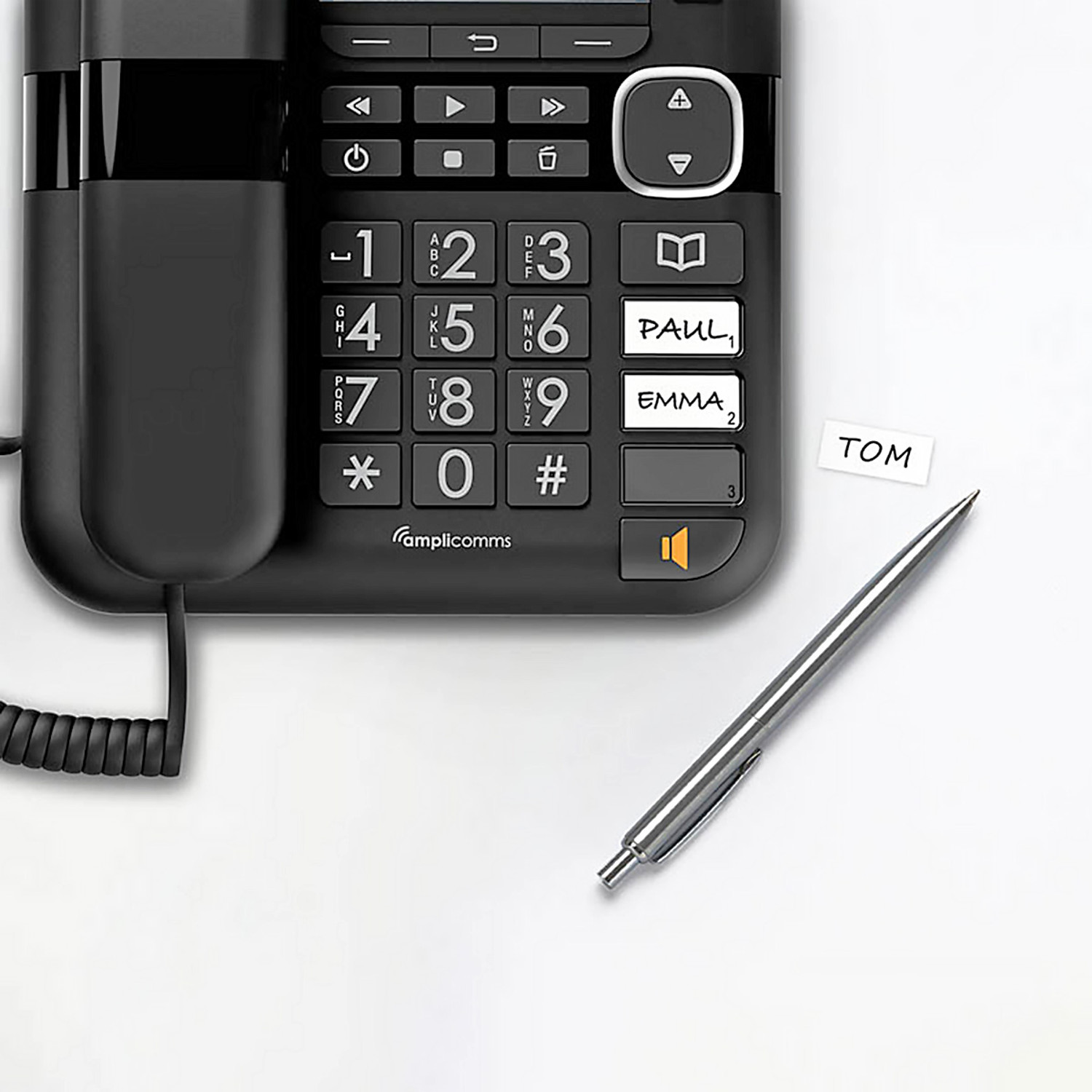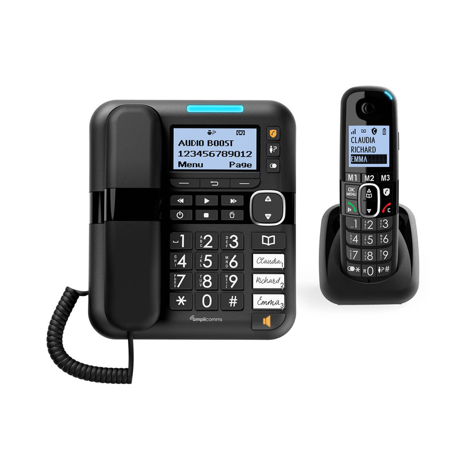 Complete set consisting of an easy-to-operate landline telephone and a cordless handset. The telephones are equipped with voice amplification up to +35 dB and ringing volume up to +90 dB. The landline is equipped with 3 preset numbers, which can also be accessed via the handset. Unwanted callers can be blocked by using the various call block functions.