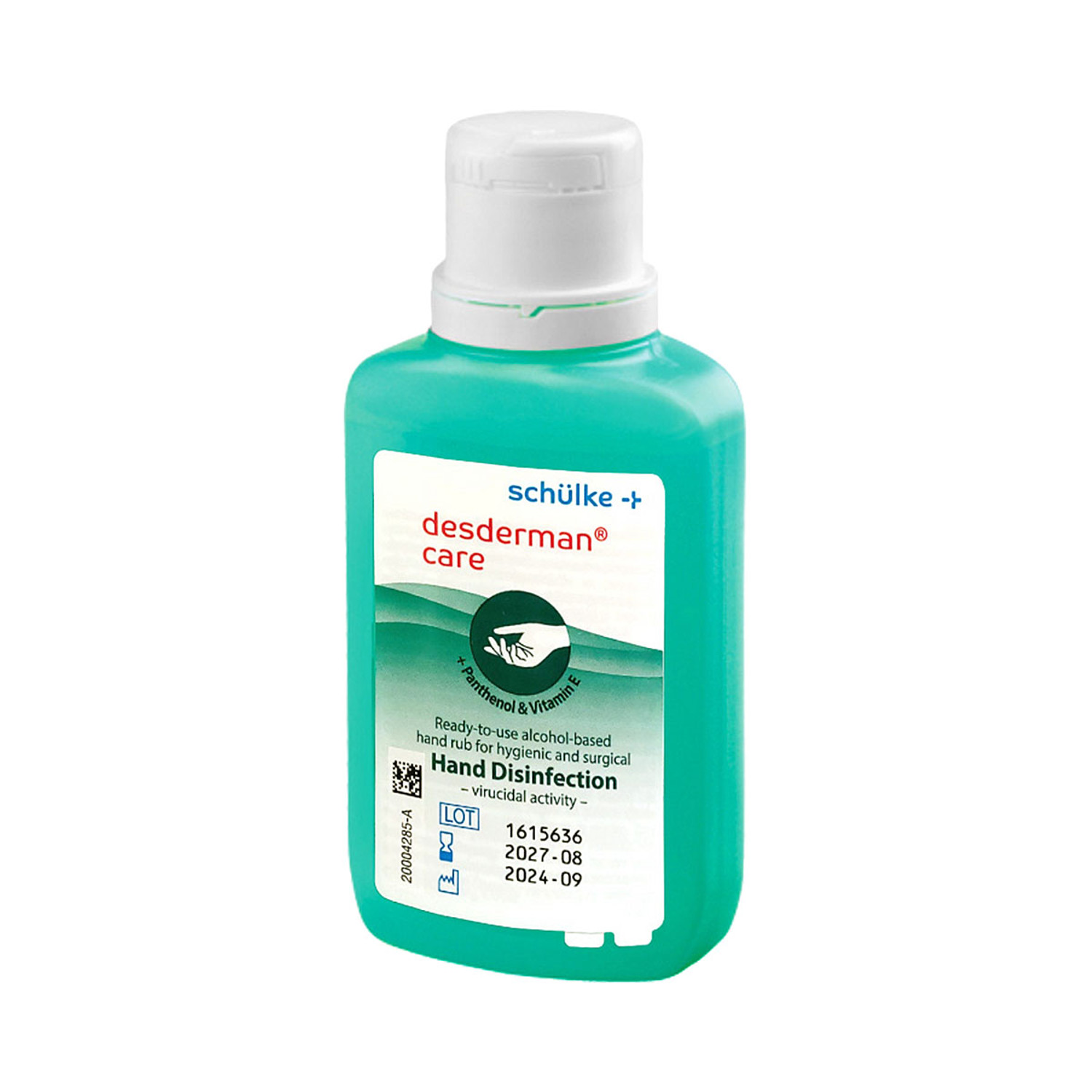 Apply a small amount of Desderman Care Hand Disinfection 100 ml to dry hands and rub thoroughly, paying extra attention to fingertips and nail beds.