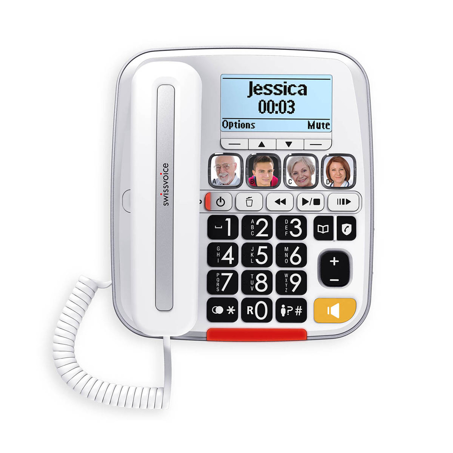 This set consists of a base with fixed handset and cordless handset. The phones are designed for people with hearing loss, impaired vision and seniors. The phones have a loud ringer and speech amplification through the boost function. The most important four contacts can be pre-programmed under the pictures on the base station. Also, these numbers correspond to the four memory keys on the cordless handset. In addition to the loud ring tone, the units will also display a red flashing light for incoming calls. Missing a call is thus a thing of the past.