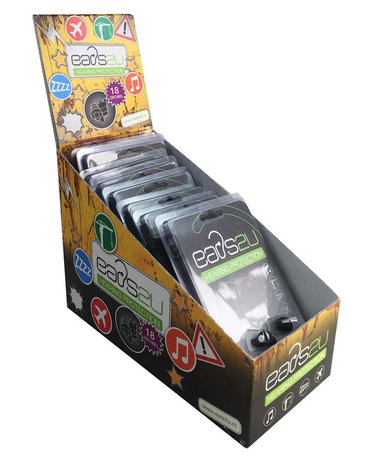 Mooie, opvallende baliedisplay met 12 blisters EARS2U gehoorbescherming.