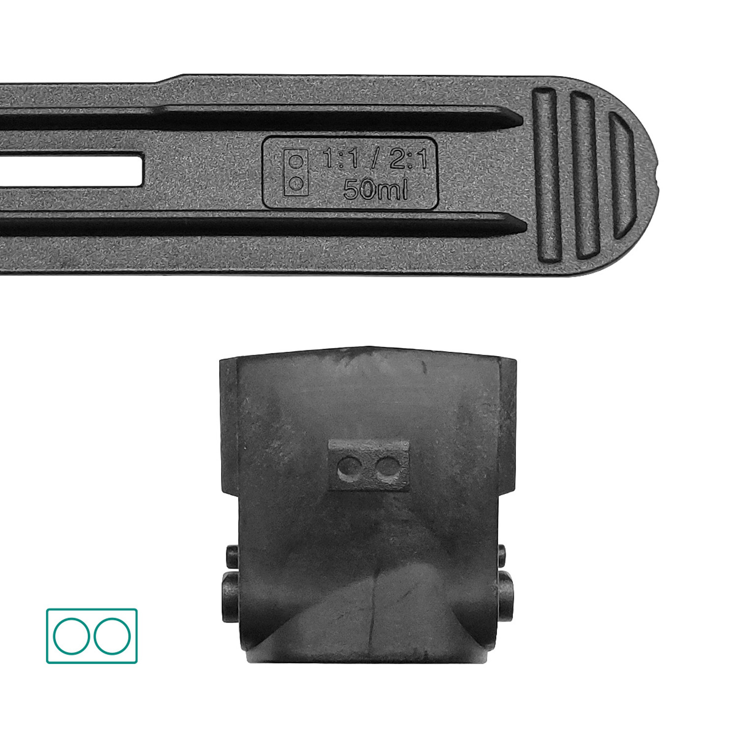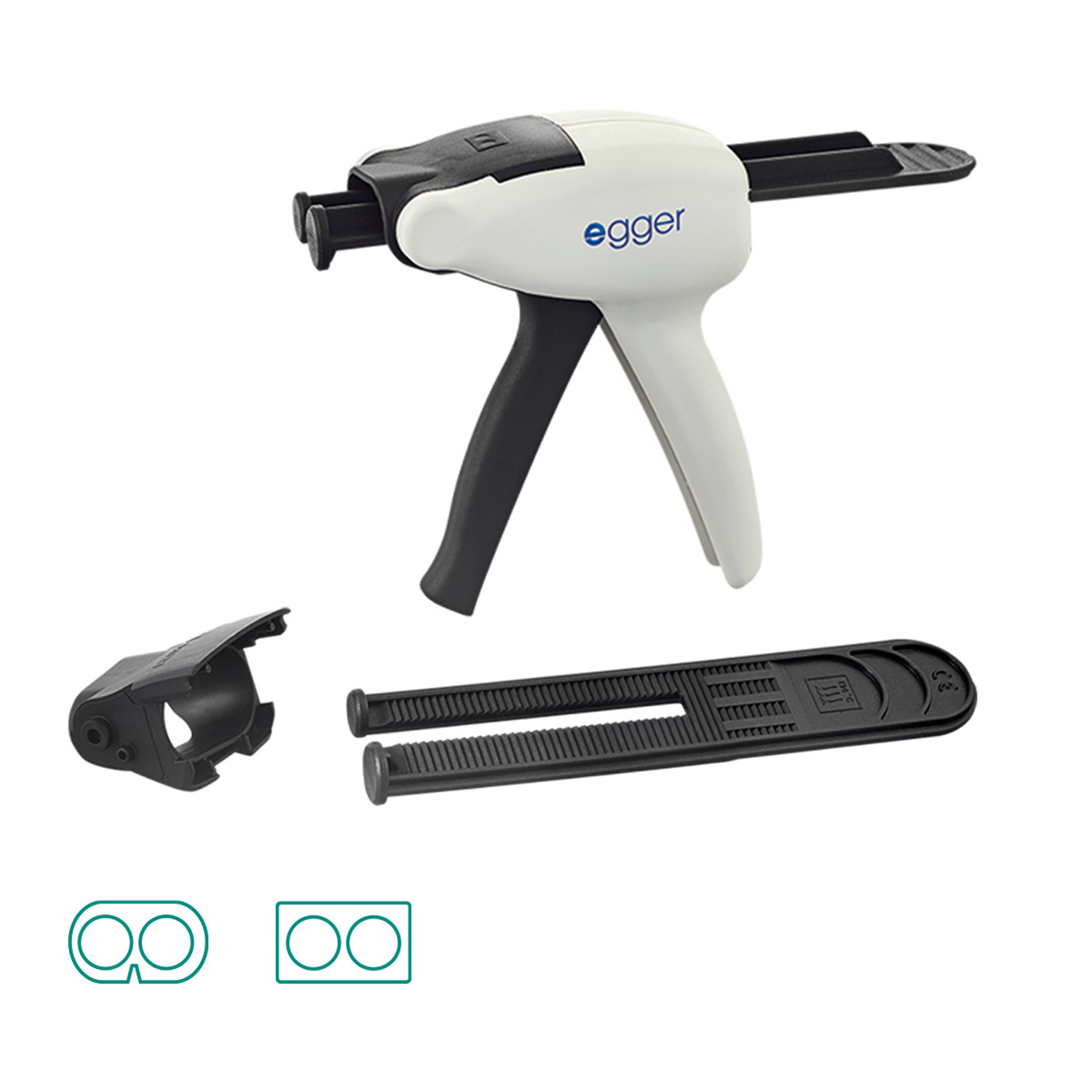Afdrukpistool van egger dat voor zowel DMA-50 als DS-50 systemen kan worden gebruikt. Het injecteerpistool wordt geleverd met twee adaptersets, waardoor deze kan worden gebruikt in combinatie met zowel de standaard als de S 50 dubbele cartridges van egger A/soft, A/ITE, A/II en Aqua). De standaard cartridges hebben een rechthoekige aansluiting (DMA-50) en de S 50 cartridges hebben een ronde aansluiting (DS-50).