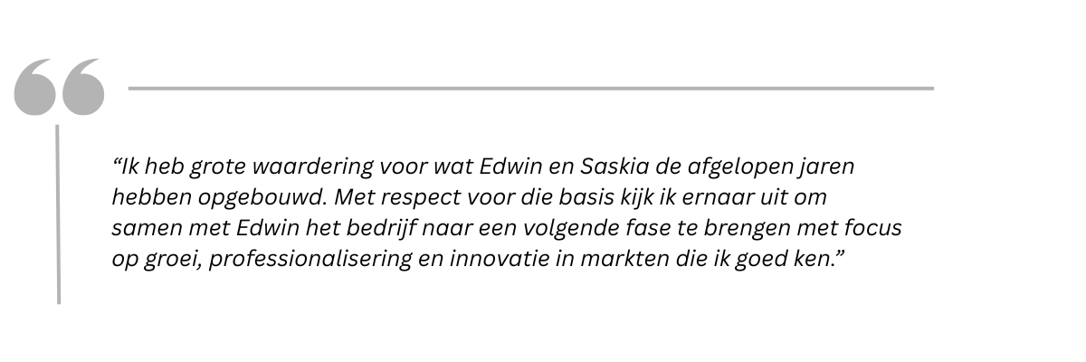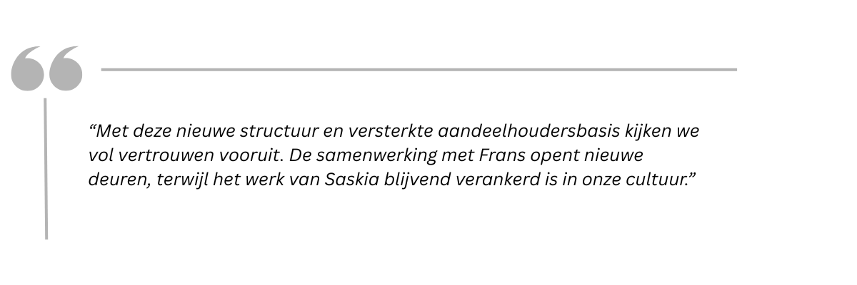 Saskia heeft na 17 jaar intensieve betrokkenheid besloten haar aandelen over te dragen vanwege gezondheidsredenen. Haar inzet en bijdrage waren van onschatbare waarde bij de opbouw van de onderneming. Wij spreken hierbij onze grote waardering uit voor alles wat zij voor onze organisatie heeft betekend.