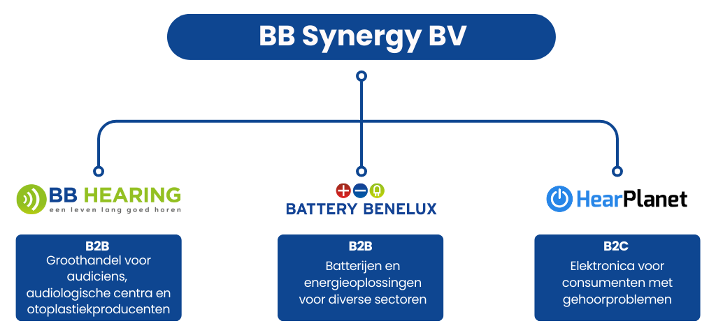 Met trots kondigen we aan dat onze organisatie vanaf heden verdergaat onder de nieuwe bedrijfsnaam BB Synergy B.V. Deze naamswijziging markeert een belangrijke stap in de groei en professionalisering van onze onderneming. Belangrijk om te benadrukken: de drie vertrouwde handelsnamen BB Hearing, Battery Benelux en HearPlanet blijven ongewijzigd bestaan en actief in de markt. Voor klanten, fabrikanten en relaties verandert er operationeel niets, behalve dat we sterker dan ooit klaarstaan voor de toekomst.