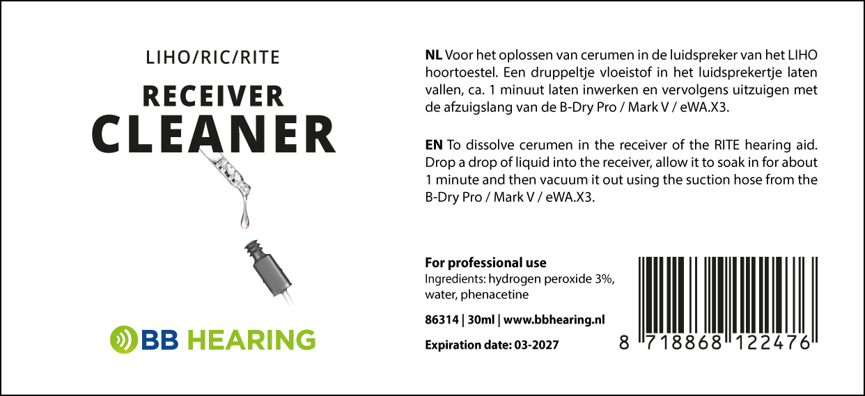 Zo kunt u een druppeltje vloeistof aanbrengen in het luidsprekertje. Kies daarbij altijd voor een hoogwaardig reinigingsmiddel voor de receiver. Het doel? Het oplossen van cerumen in de luidspreker! U laat de vloeistof slechts één minuut inwerken. U verdroogt dan feitelijk het vastzittende oorsmeer, waarna u deze uitzuigt met professionele afzuigapparatuur.